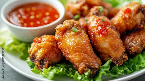 Close up of gourmet fried chicken featuring tender meat, paired with a sweet chili dipping sauce and fresh lettuce, beautifully arranged on a white plate for an appetizing presentation.