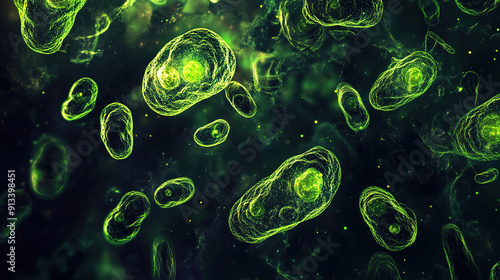 Close up of green and glowing microscopic cells with dark background. Wallpaper photo for learning biology, science, cells.
