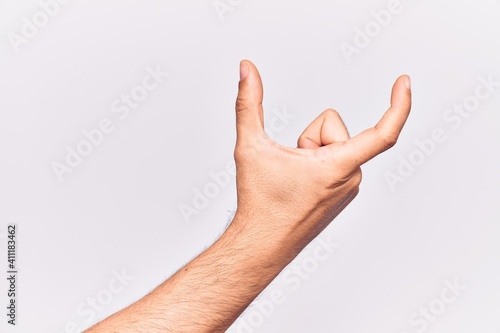 Close up of hand of young caucasian man over isolated background picking and taking invisible thing, holding object with fingers showing space
