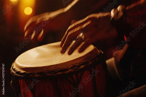 Close up of hands playing a djembe drum with rhythm, creating a warm and captivating musical atmosphere