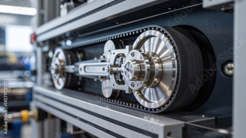 Close up of industrial machinery with metal belts and pulleys working smoothly in modern factory environment with precise engineering
