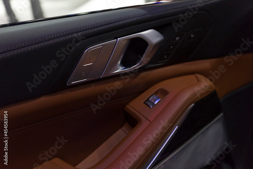 Close up of interior door handle of a modern premium car.