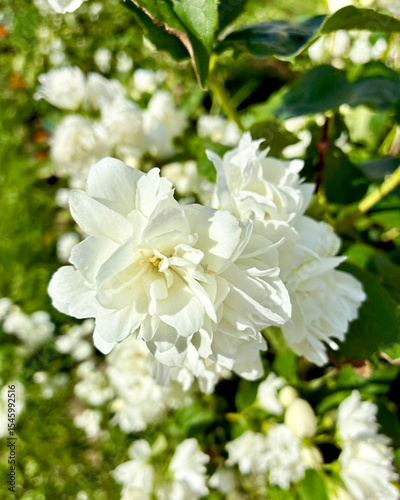 Close up of jasmine flowers among lush green foliage. Philadelphia, Mock Orange. Blooming.