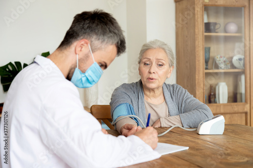 Close up of male doctor in medical mask visit old lady patient measure blood pressure on electronic device. Regular checkup of grandmother using medical digital tonometer at home