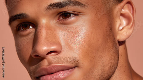 Close up of male skin illuminated by soft peach light showing smooth texture and natural freckles with warm brown eyes and subtle facial hair in calm expression