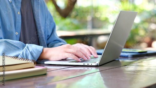 Close up of man hand tying laptop computer while sitting in campus, online class, e learning