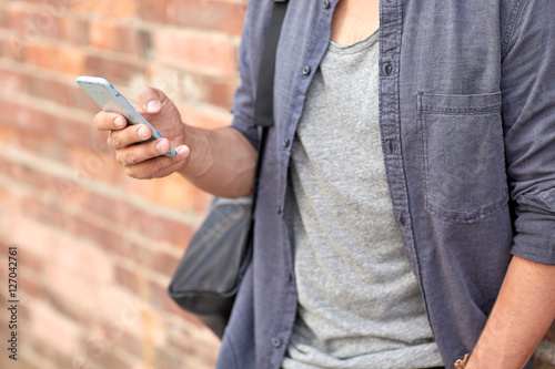 man, smartphone, bag, texting, city, tour tourism, travel, street, outdoors, young, summer, vacation, holiday, holiday maker, people, person, lifestyle, hipster, male, concept, urban, town, brick wall, contraption, app, application, technology, mobile phone, mobile, phone, communication, connection, online, mobile phone, messaging, wall, backpack, closeup, hand