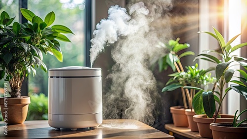 Close up of modern air humidifier releasing steam for indoor plant care during heating period, humidifier, modern