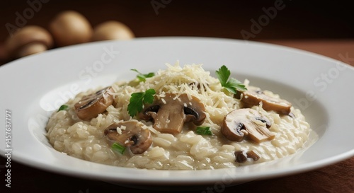 mushroom, risotto, plate, food, dish, cookery, italian, rice, dinner, lunch, epicure, delicious, eatery, meal, cheese, parmesan, parsley, white, background, closeup, creamy, cooked, tasty, fresh, vegetable, vegetarian, healthy, nourishment, ingredient, grain, fungal, brown, table, wooden, fine dining, presentation, culinary, receipe