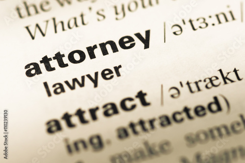 Close up of old English dictionary page with word attorney