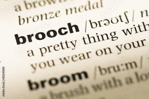 Close up of old English dictionary page with word brooch