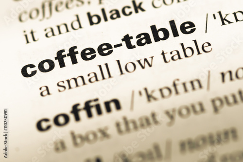 Close up of old English dictionary page with word coffee table