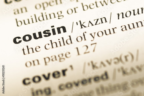 Close up of old English dictionary page with word cousin