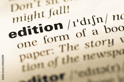 Close up of old English dictionary page with word edition