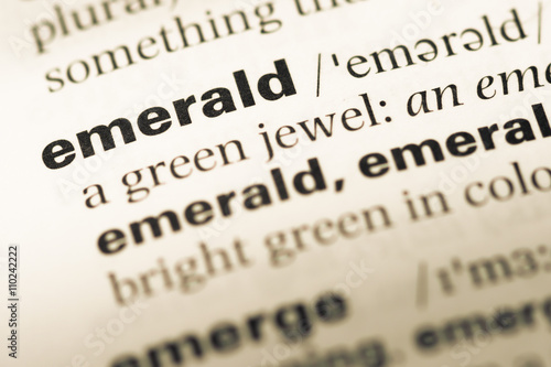 Close up of old English dictionary page with word emerald