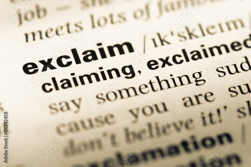 Close up of old English dictionary page with word exclaim