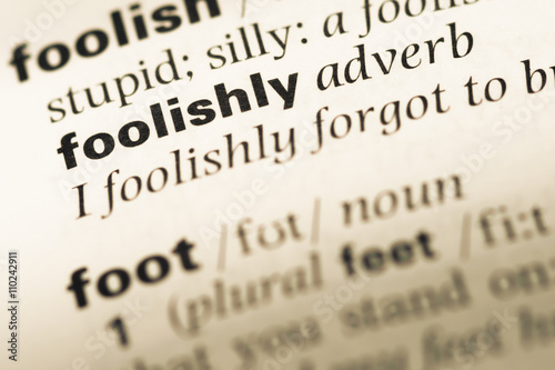 Close up of old English dictionary page with word foolishly