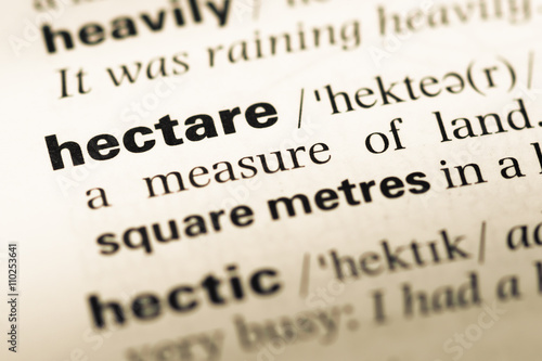Close up of old English dictionary page with word hectare