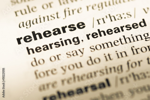 Close up of old English dictionary page with word rehearse