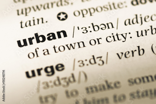 Close up of old English dictionary page with word urban