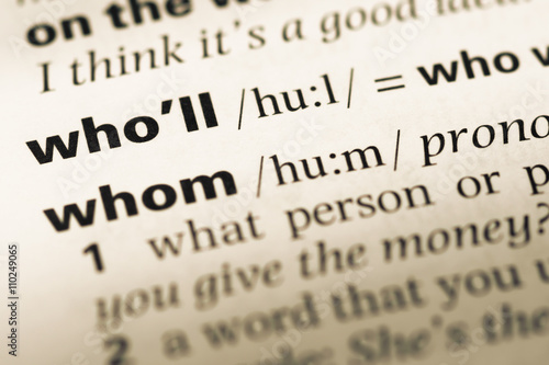 Close up of old English dictionary page with word who'll