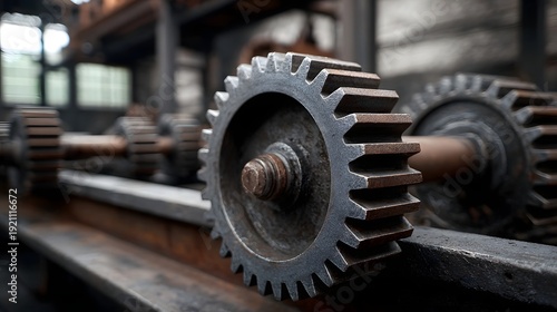 Close up of old rusty industrial gears on a shaft in a dimly lit factory setting