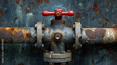 Close up of old water valve and steel plumbing joint with red knob space for text