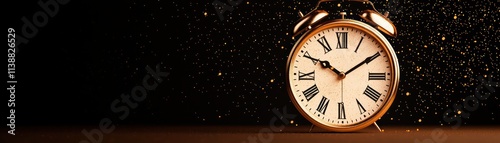 clock, alarm, closeup, glowing, particle, vintage, time, elegance, gold, black, decoration, home, interior, design, classic, round, number, shiny, background, light, sparkle, retro, hours, minute, craftsmanship