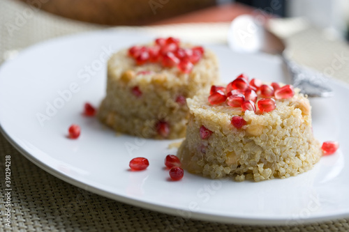 Close up of quinoa pilaf with chickpeas and pomegranate