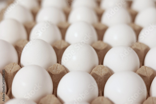 Close Up of raw chicken eggs in paper egg tray. Group of Fresh white Eggs in a cardboard cassette. Organic food from nature good for health