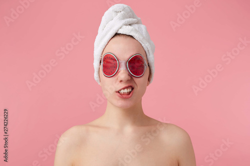 beautiful, good, photo, portrait, face, camera, indoor, isolated, over, pink, background, shower, natural, wellness, spa, skin, relaxation, cosmetology, cosmetic, cosmetic, healthy, bathroom, clean, wrong, lip, mask, frown, frowning, unhappy, displeased, disconnected, sad, problem, doubt, doubting, misunderstanding, distrust, query, disgust, girl, lady, female, woman, young, adult, cute, nice, beauty