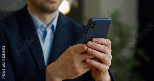 Close up of smartphone in hands. Businessman tapping and scrolling on mobile phone in office.