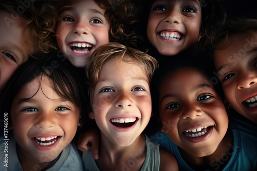 Close up of smiling young children. Happy faces of children close up. Portrait of happy diverse group of kids hugging in a park together for fun