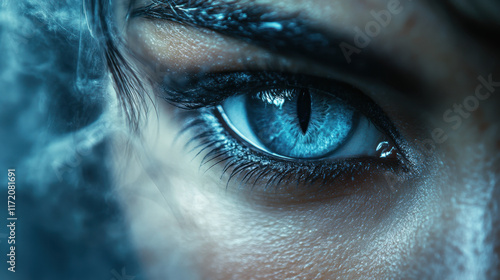 close up of striking blue eye, surrounded by misty atmosphere, showcasing intricate details and textures. image evokes sense of mystery and depth