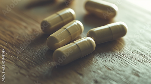 close up of taupe colored capsules sitting on a wooden table