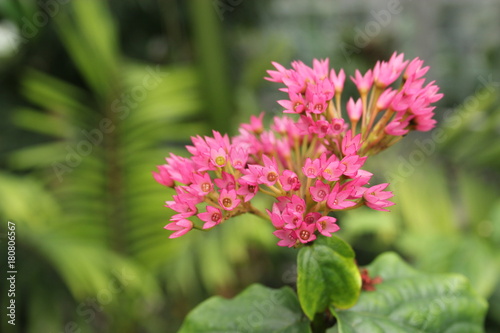 close up of tiny bright pink flowers with tropical foliage blurred in background