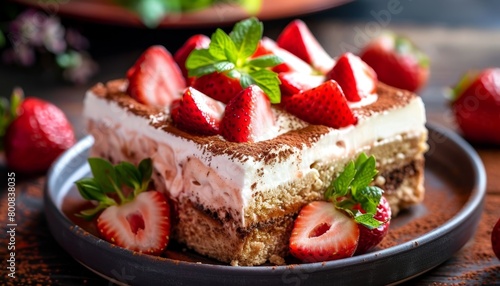 Close up of traditional Italian tiramisu with strawberries and mascarpone