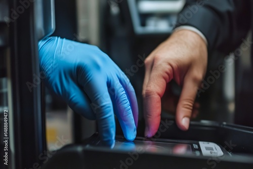 hand, gloved, scan, device, technology, finger, blue, skin, scanner, security, access, control, biometric, identification, authentication, protection, safety, medicals, health care, research, laboratory, equipment, glove, exam, analysis, digital, electronic, interface, touch, dark