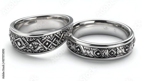 ring, silver, jewellery, ornate, metal, wedding, engagement, fashion, luxury, accessory, closeup, texture, pattern, design, isolated, white background, gemstone, precious, object, detail, elegant, style, craftsmanship, shiny, pair, matching, symbol, love, couple, celebration, gift, beautiful, precious metal, ornament, decorative, surface, gem, artistic, commercial, editorial