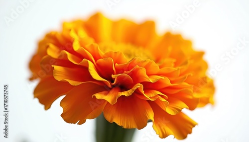 Close up of vibrant orange marigold flower petals detailed texture. Natural bloom isolated on white background. Bright, fresh, organic plant blossom in macro view.