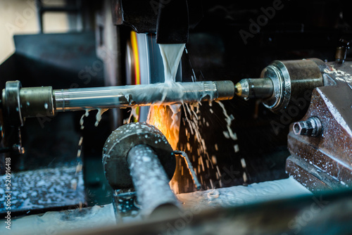Close up of view Grinding machine working hight-speed until have metal sparks in factory, Process grinding metal, metalworking machinery.