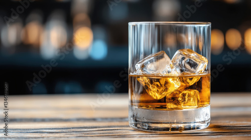 close up of whiskey glass filled with ice cubes, showcasing rich amber color