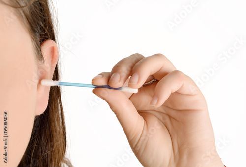 Close up of woman cleaning her ear with a cotton swab