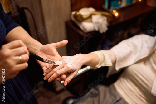 Close up of woman during dry hands moisturizing treatment at salon.