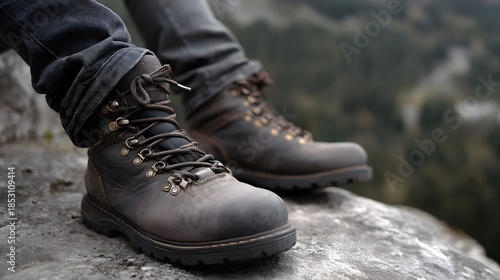worn, leather, hiking, boot, rock, blurred, mountain, landscape, footwear, lace, adventure, travel, nature, stone, ground, surface, texture, rugged, dirty, hard-wearing, sturdy, grip, sole, metal, brown, dark, grey, denim, jean, leg, person, closeup, detail, sharpened, background, blur, scenery, view, summit, trail, path, journey, trekking, outdoors, wilderness, freedom, active, lifestyle