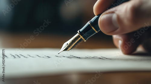 close up of writer hand holding fountain pen, capturing elegance of writing. ink flows smoothly on paper, creating beautiful script