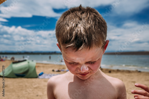 close up of young boy at the beach with sunscreen on nose