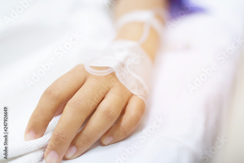 close up people focus on the hand of a patient sick on the bed in hospital ward. healthcare and medical