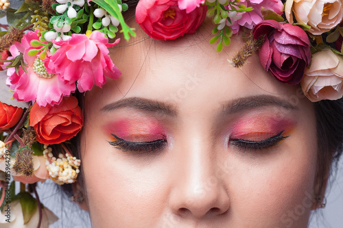 Close up perfect skin face and beautiful eyeshadow, Brunette woman with luxury makeup, Eyelashes. Cosmetic eyeshadow. Close up woman close eye with flower on her head.