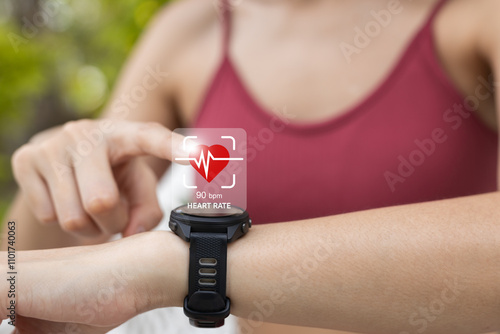 Close up person Point to smartwatch displaying heart rate application. Monitoring virtual display measure heart rate before after physical exercise. wristwatch checking heart beats and pulse.